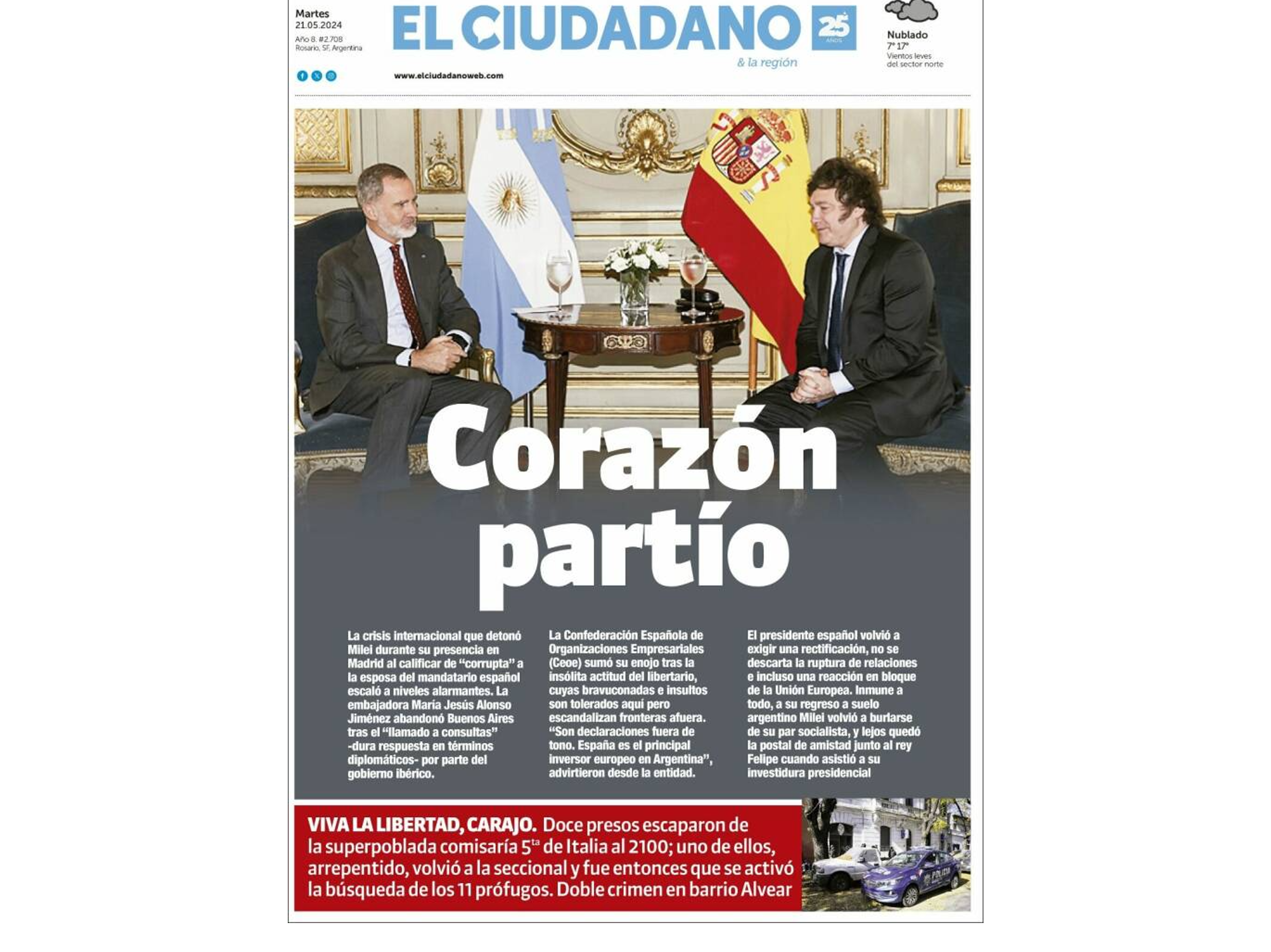 “Broken heart,” titles Argentine daily El Ciudadano after Argentine President Javier Milei made incendiary comments about Spanish Prime Minister Pedro Sánchez and his wife, Begoña Gómez, at a far-right rally in Madrid on Sunday. Milei accused Gómez of corruption and criticized Sánchez for his delayed response to the allegations, which Sánchez has dismissed as part of a far-right smear campaign. Relations between Spain and Argentina have deteriorated sharply since, with the Spanish government demanding an apology and withdrawing its ambassador from Buenos Aires.