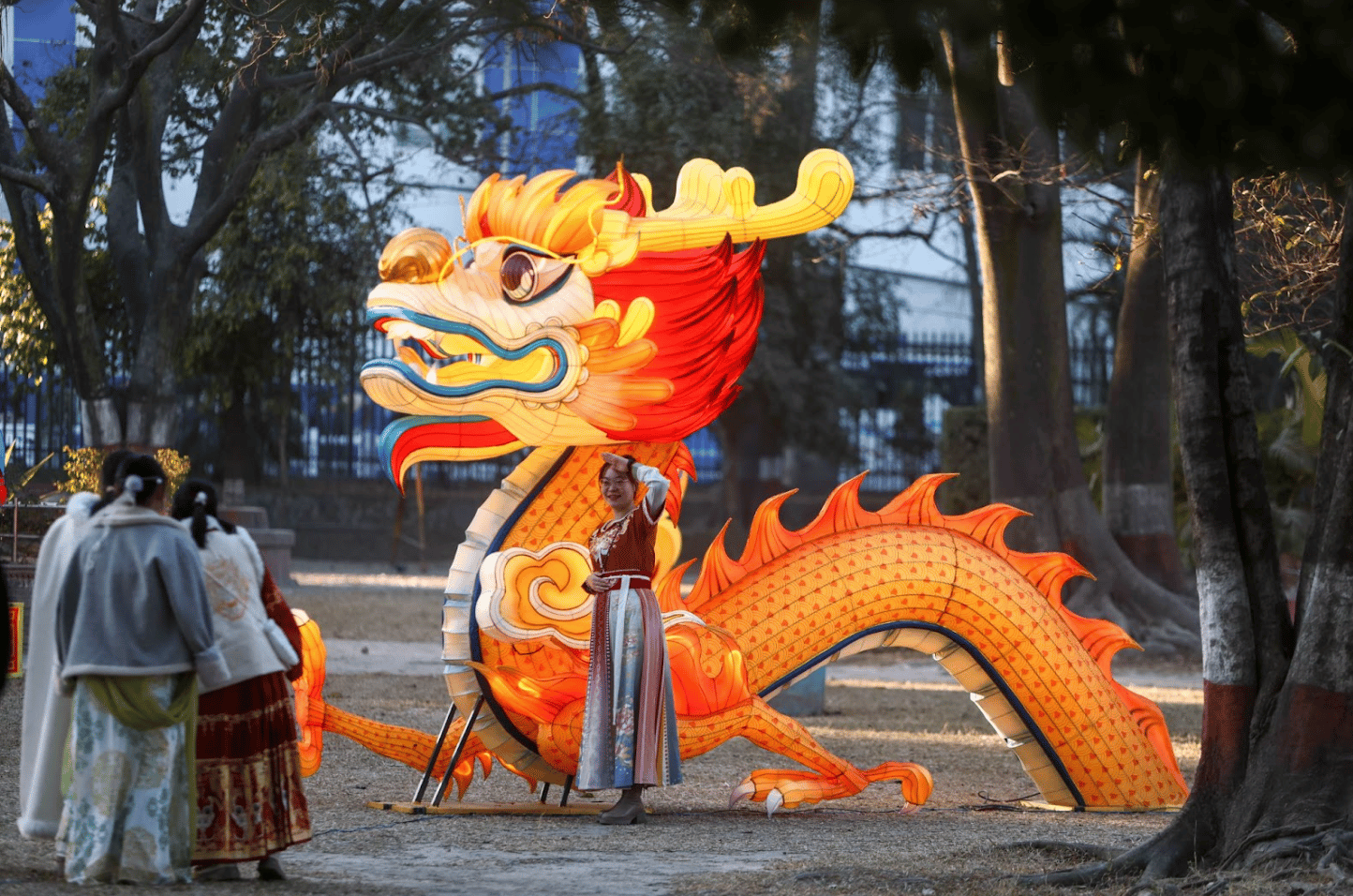Posing in front of Lunar New Year decorations during a lantern show in Kathmandu, Nepal. The event, celebrated by billions of people across the world, kicks off tomorrow and marks the start of the Year of the Dragon. — Photo: Sulav Shrestha/Xinhua/ZUMA