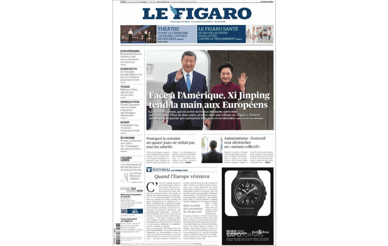 French daily Le Figaro dedicates its front page to Chinese President Xi Jinping’s visit to Europe, the first in five years, which began yesterday in France. Alongside French President Emmanuel Macron, European Commission President Ursula von der Leyen plans to advocate for fair competition with China during talks with Xi Jinping. The discussions come amid EU investigations into Chinese trade practices, including subsidies for various industries and concerns about Chinese espionage and military cooperation with Russia. Xi's visit to Europe is viewed as a test of the EU's approach to balancing relations between China and the United States, with European leaders divided over their response to the U.S.-China rivalry.