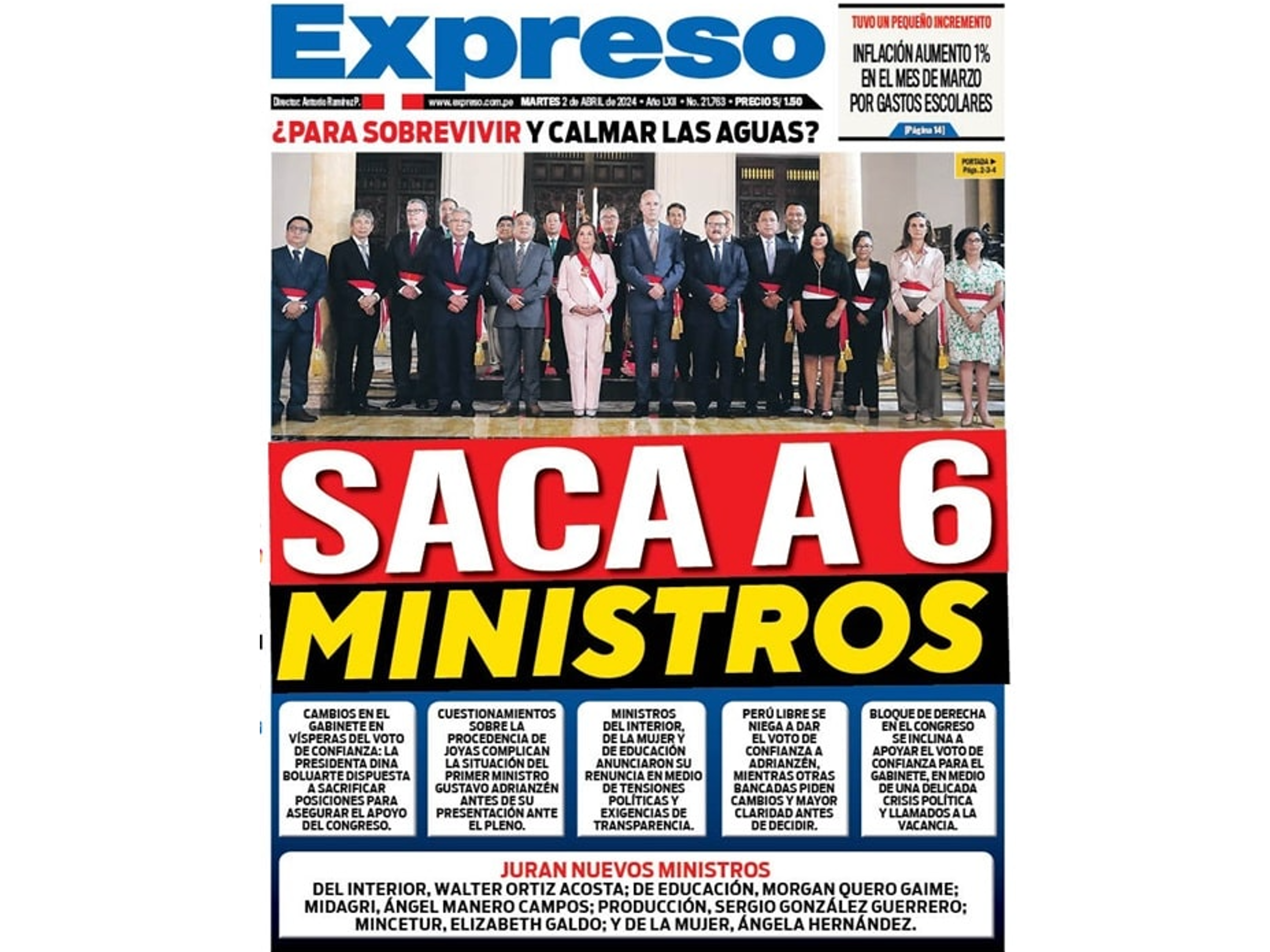 Lima-based daily Expreso’s front page highlights the repercussions of the recent “Rolexgate” scandal rocking the country. Six Peruvian ministers have resigned and a bid has been submitted to remove President Dina Boluarte from office, following a raid on the leader’s house and office on Saturday in search of luxury Rolex watches Boluarte allegedly failed to declare.
