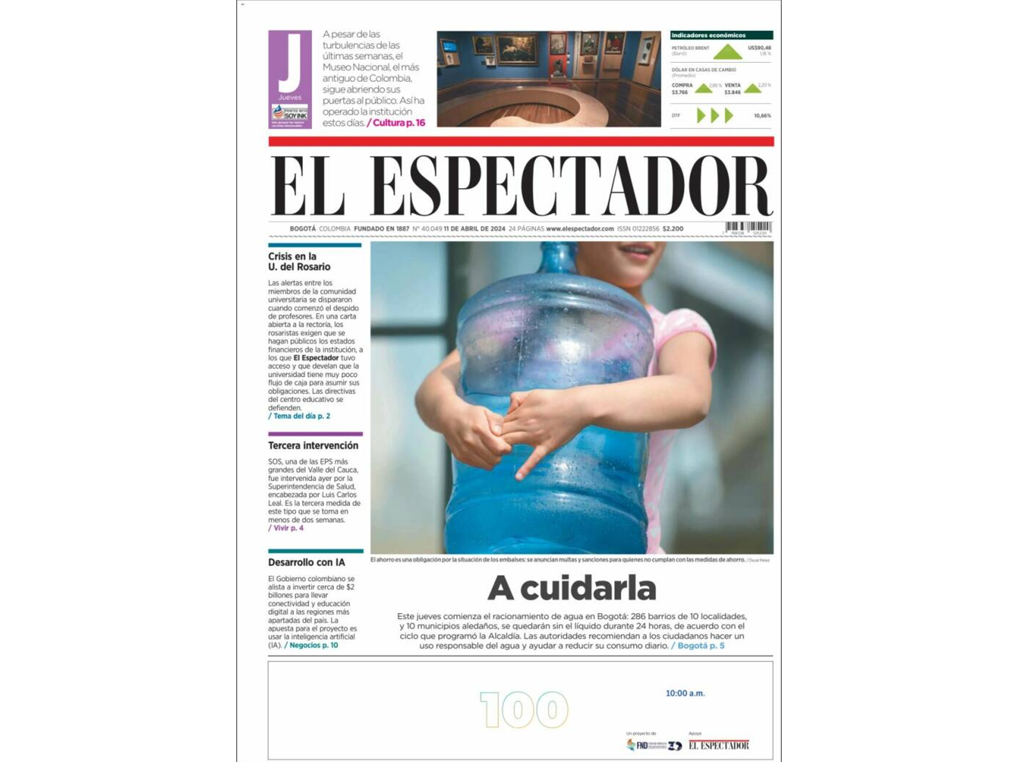 Colombian newspaper El Espectador dedicates its front page to Bogotá implementing water rationing due to historically low reservoir levels exacerbated by the El Niño climate pattern. Mayor Carlos Fernando Galán announced restrictions affecting 9 million people, starting Thursday. The rationing plan involves rotating water restrictions across nine zones, with hospitals and schools having contingency plans. It aims to reduce consumption and ensure sustainability amid the water crisis.