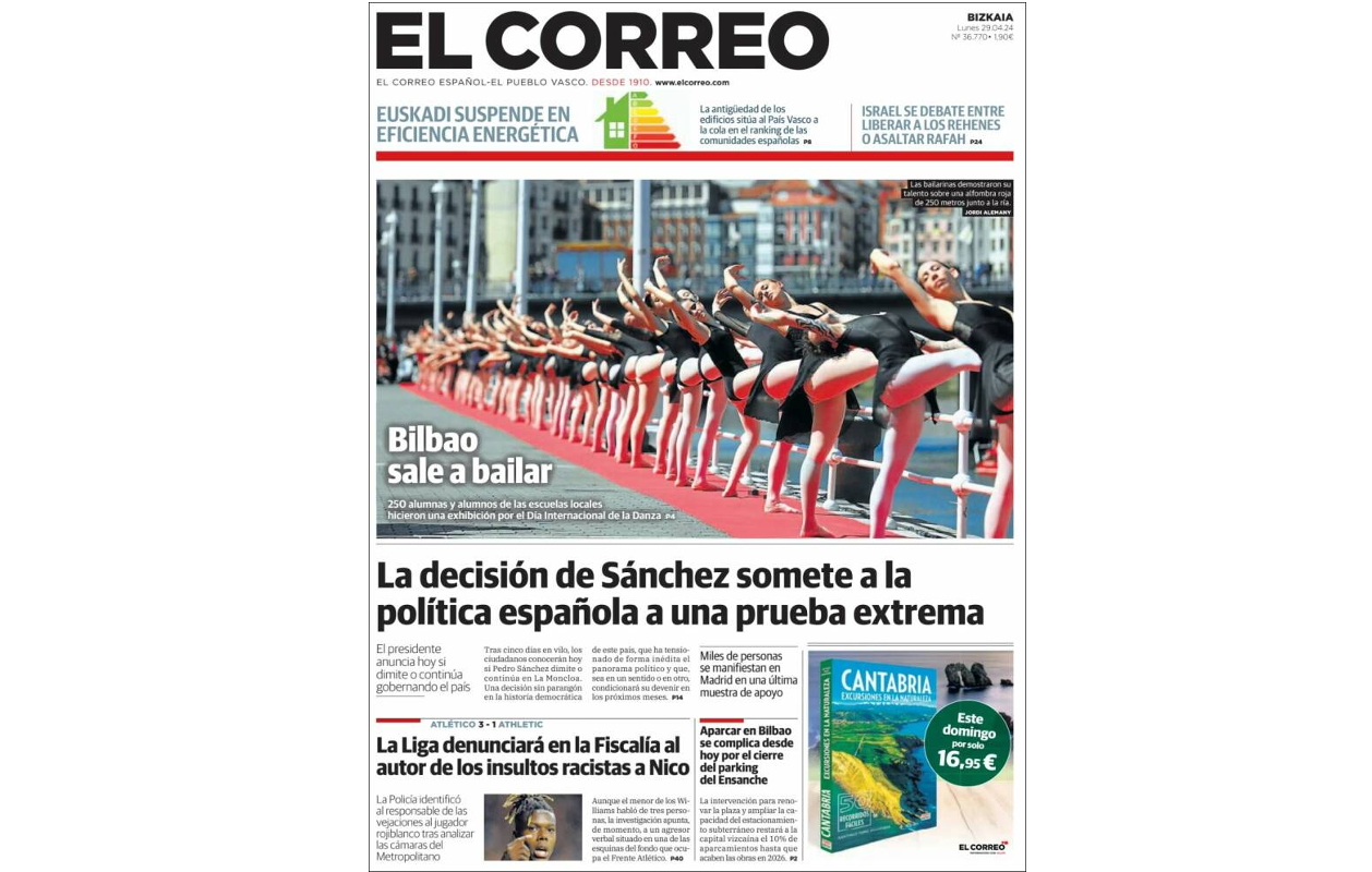Bilbao-based daily El Correo devotes part of its front page to the Basque city’s dance celebrations on International Dance Day, ahead of Prime Minister Pedro Sánchez’ announcement on Monday that he will stay in office and continue to lead the government. Sánchez had threatened to resign after his wife was accused of corruption, which he denounced as politically motivated.