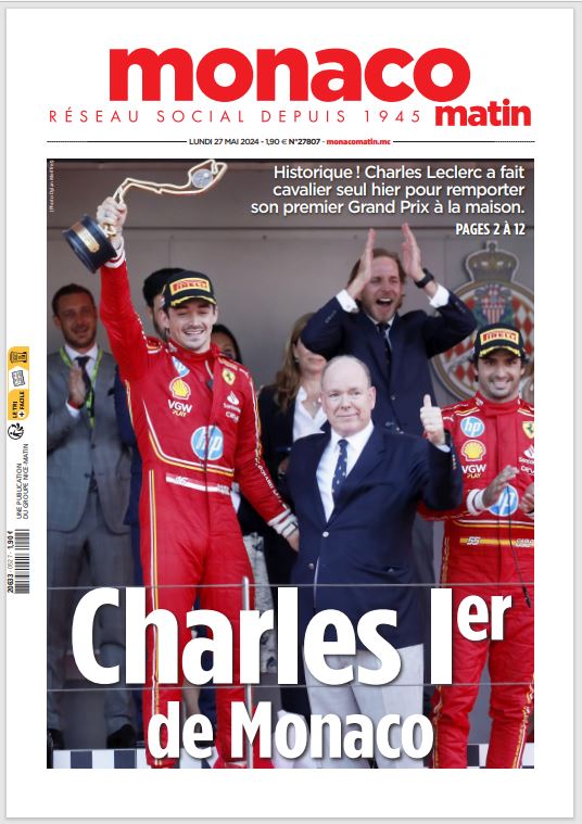 Monaco-Matin celebrates Formula One racing driver Charles Leclerc on its front page, dubbing him “Charles I of Monaco.” On Sunday, Leclerc became the first Monegasque driver to win the Monaco Grand Prix in the world championship era. Leclerc, 26, said that this victory on home soil was “the ultimate dream,” as the Ferrari driver ended his 39-race winless streak.