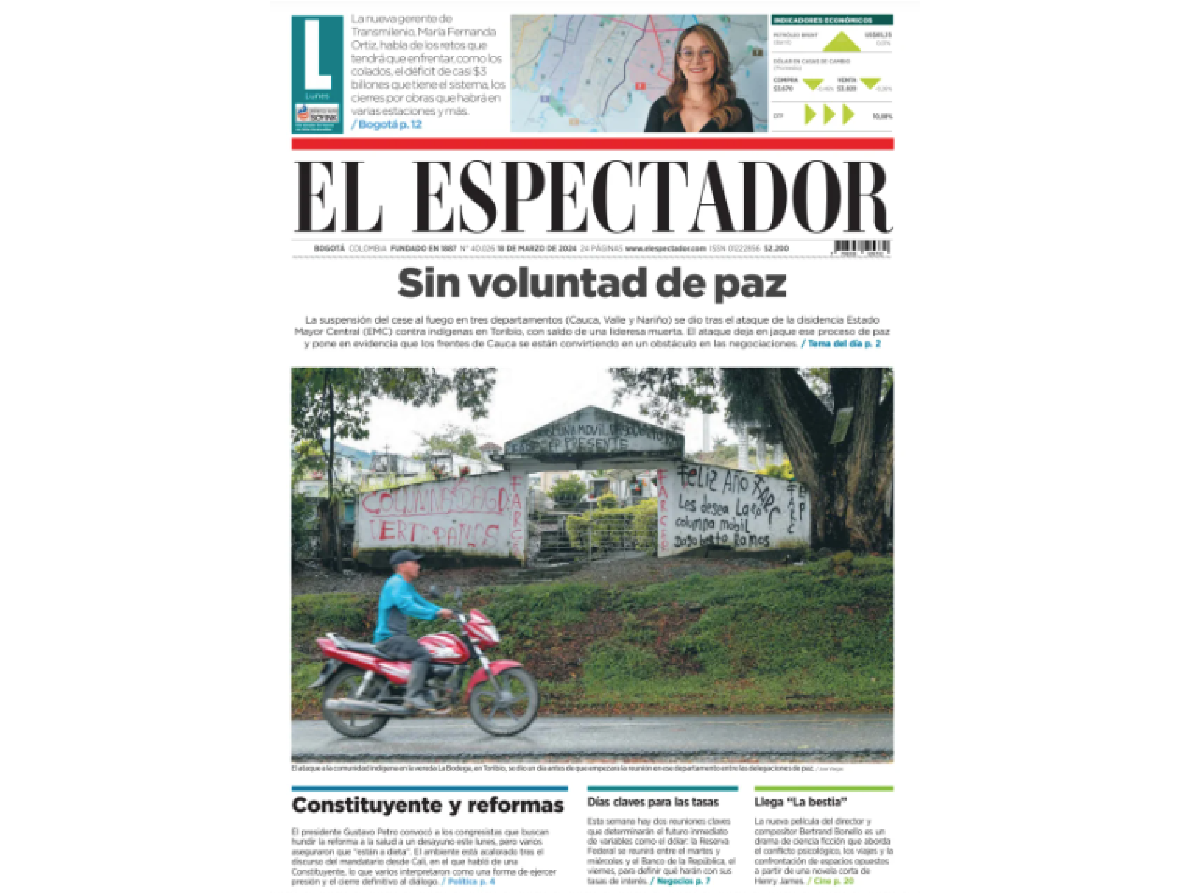 “No will to maintain peace.” Bogota-based El Espectador dedicates its front page to the end of the truce with armed rebels of the Central General Staff (EMC) in three departments in the country: Narino, Cauca and Valle del Cauca. This suspension of ceasefire, signed a year ago between President Gustavo Petro's administration and the dissident faction of the FARC group, follows a series of violent attacks from the guerrillas in these regions, including a strike on an Indigenous group that left one woman dead.