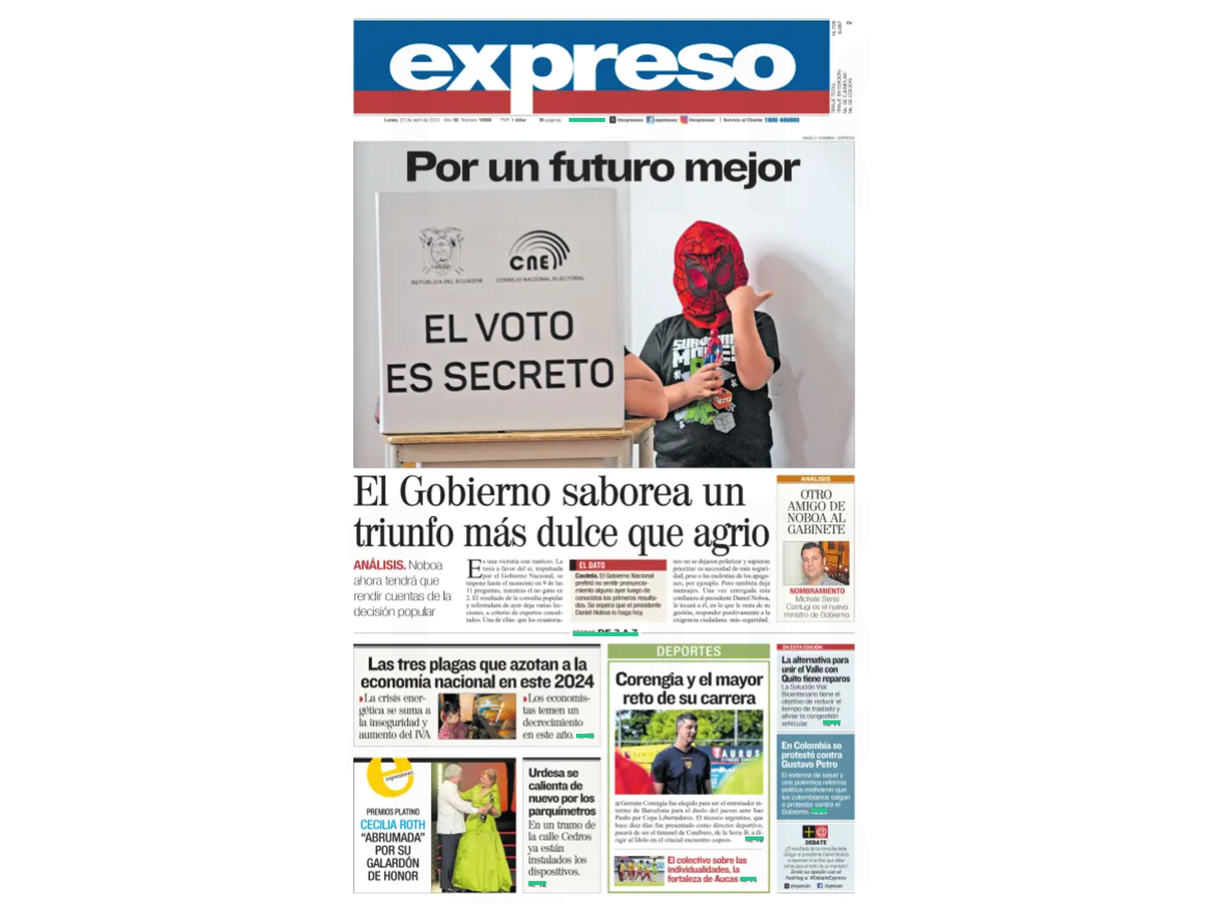 Ecuadorian daily Diario Expreso dedicates its front page to the results of a referendum on new laws to fight drug trafficking and gangs in the South American country. Initial results showed that some 65% of voters approved the measures, which include extradition of organized crime leaders to the United States as part of an ongoing crackdown by tough-talking Ecuadorian President Daniel Noboa. Violence marred the voting in some places, including the killing of a prison warden.