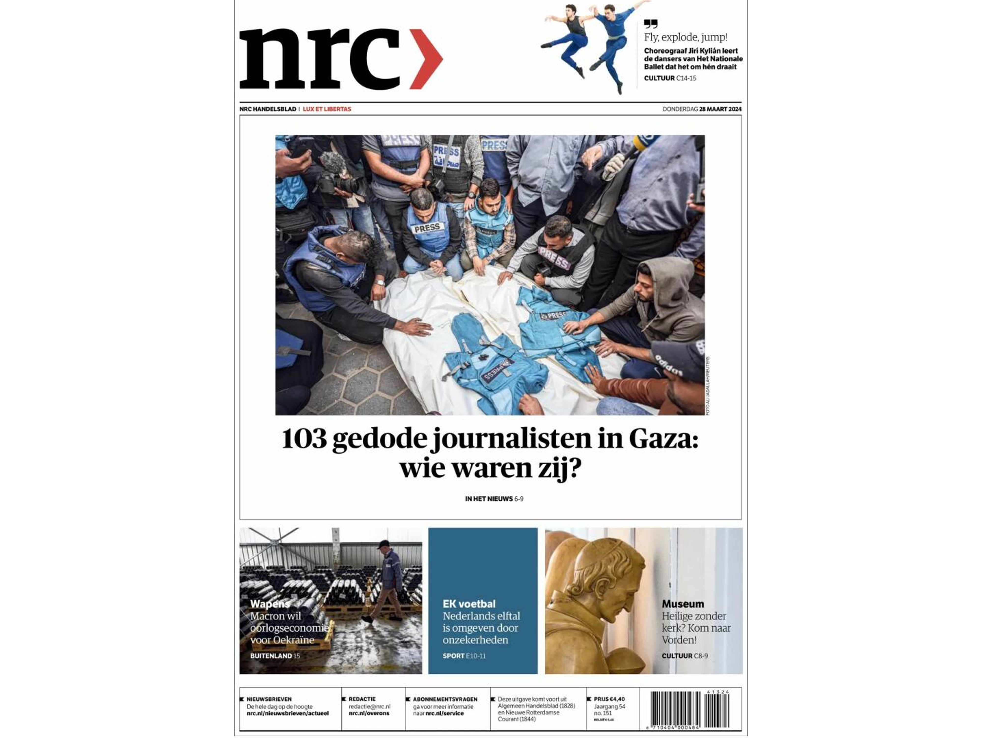 “Who were they?” asks Amsterdam-based daily NRC as it devotes its front page to the 103 journalists killed in Gaza since the start of Israel’s retaliatory actions over Hamas’s Oct. 7 attack. Read more on attacks against journalists in Gaza with this piece, translated from Arabic by Worldcrunch: Free Press Or Hamas Agent? Inside Israel's Campaign Targeting Al Jazeera Journalists In Gaza.