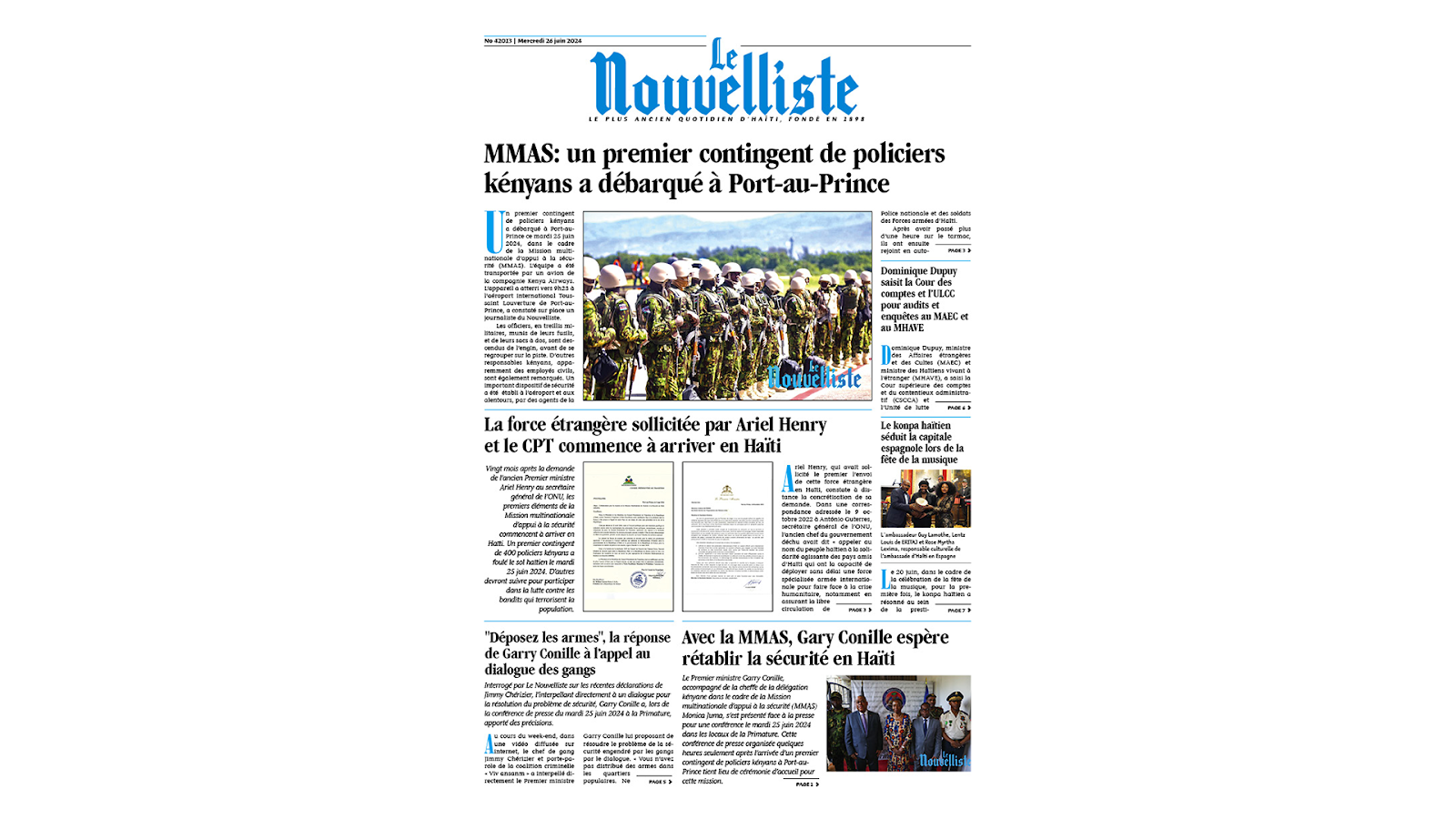 Haitian daily Le Nouvelliste dedicates its front page to the arrival of the first contingent of Kenyan police in Port-au-Prince. Hundreds of officers flew to the island Tuesday to launch a United Nations-backed mission to combat powerful armed gangs who are now controlling almost 80% of the capital. Over half a million people have been displaced because of the violence and nearly five million are facing severe food insecurity. “Kenya's sole purpose is to serve as agents of peace,” Kenyan Foreign Minister Monica Juma said during a press conference, with the protection of civilians and state institutions being a priority, as well as opening up routes for movement of people, goods and humanitarian aid. Earlier this year, French writer Pierre Haski provocatively asked: What if Haiti can’t be saved?