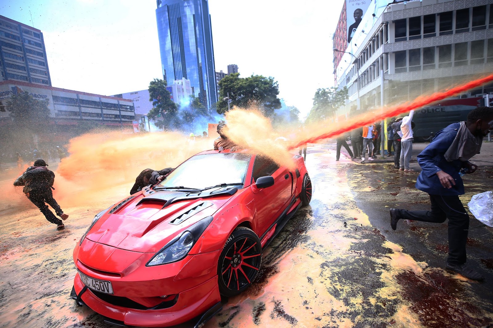 Kenyan police are spraying protesters with water cannons in Kenyatta Avenue, Nairobi, during demonstrations opposing the Finance Bill 2024. It would include a 2.75% levy on income for the national medical insurance plan, as well as increased taxes on vegetable oil and fuel, weighing heavily on the daily life cost for millions of citizens. — Photo: Kanyiri Wahito/ZUMA Press Wire