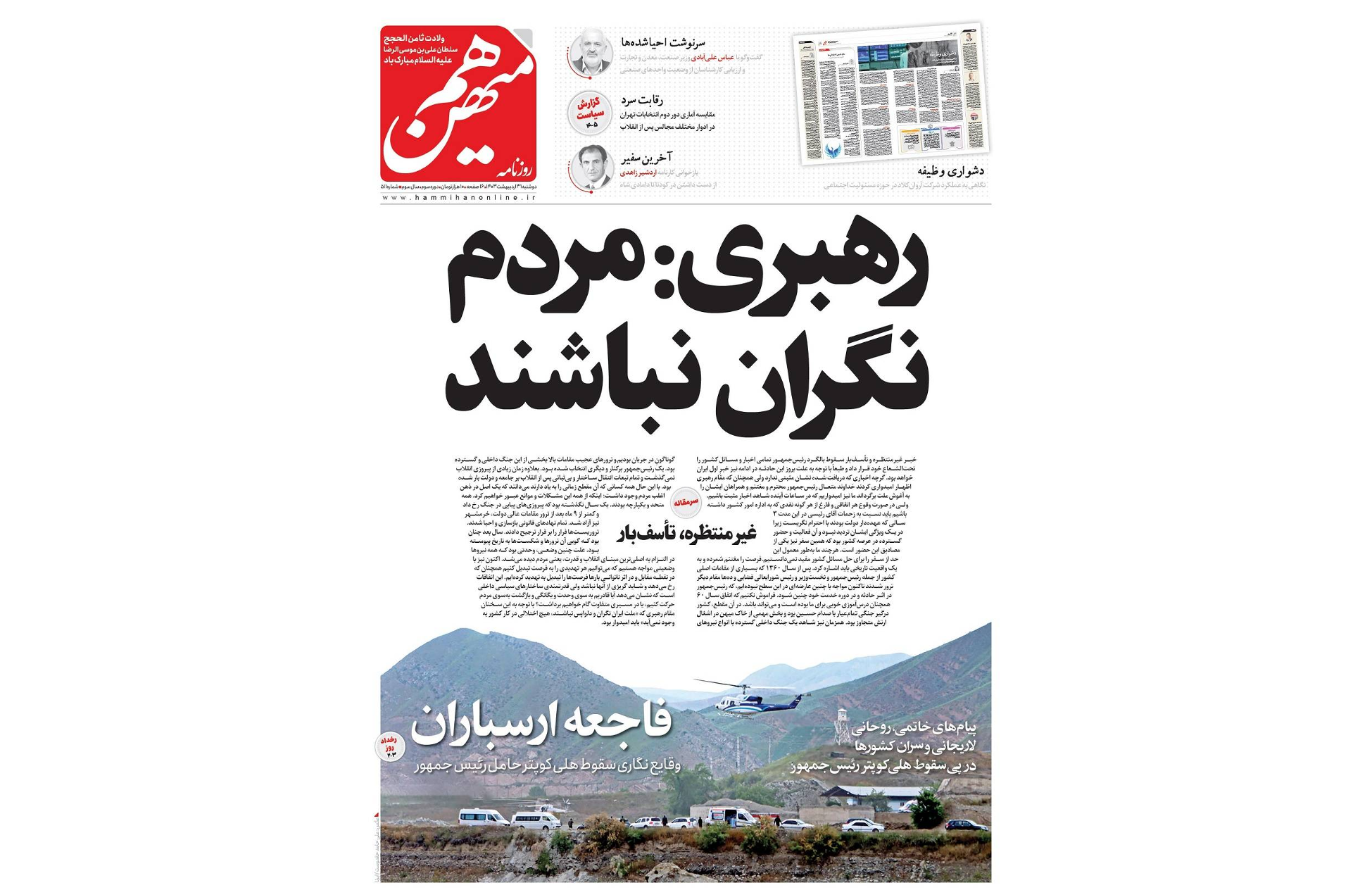 Tehran-based newspaper Ham-Mihan dedicates its front page to the deadly helicopter crash of Iran's President Ebrahim Raisi and Foreign Minister Hossein Amir-Abdollahian near the Azerbaijan border, and Supreme Leader Ayatollah Ali Khamenei assuring the nation of continued stability. A government cabinet statement also emphasized that the government's operations will proceed uninterrupted.