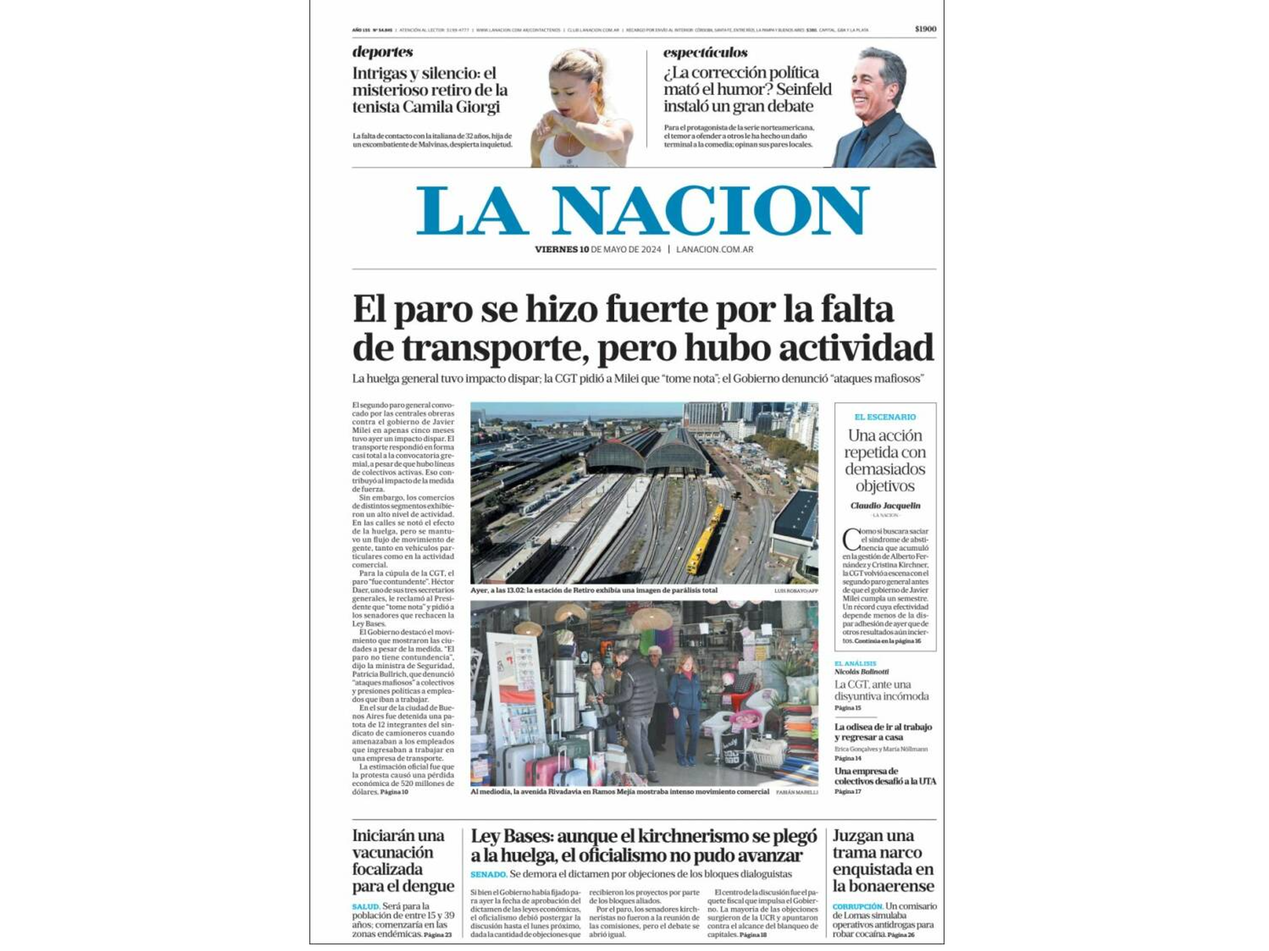 Argentine daily La Nación features on its front page an image of Buenos Aires’s Retiro train station, which is an “image of total paralysis.” On Thursday, workers began a general strike against the austerity policy of President Javier Milei. The strike has affected most of Argentina, with schools, banks, shops and transport services all being affected. Milei, who came into power in December, has started to implement spending cuts he says are necessary to reduce public deficit and control Argentina’s inflation rate, which is the highest in the world.